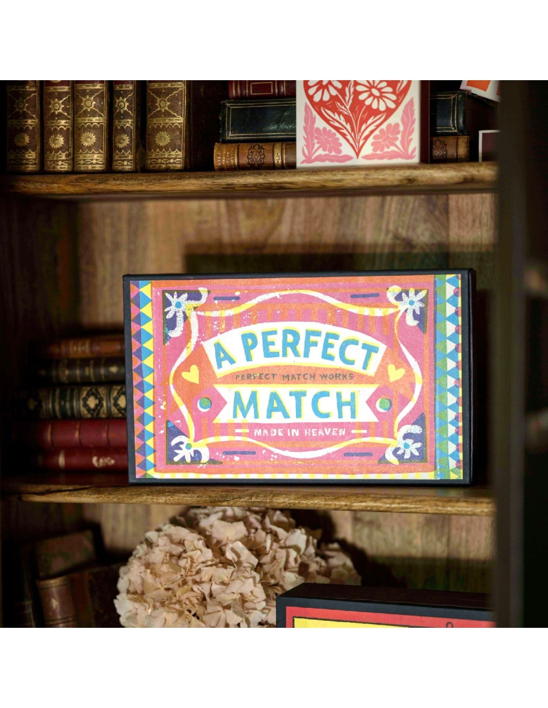 Les allumettes géantes ARCHIVIST arborent un design éclatant de roses, d'oranges, de jaunes et de bleus, avec l'inscription « Perfect Match » en caractères blancs gras.