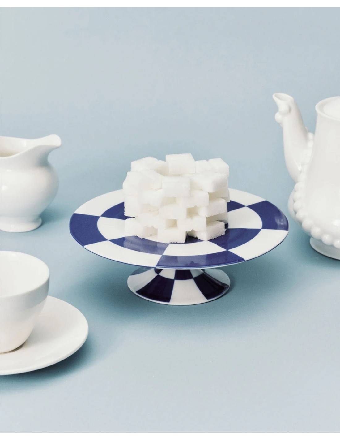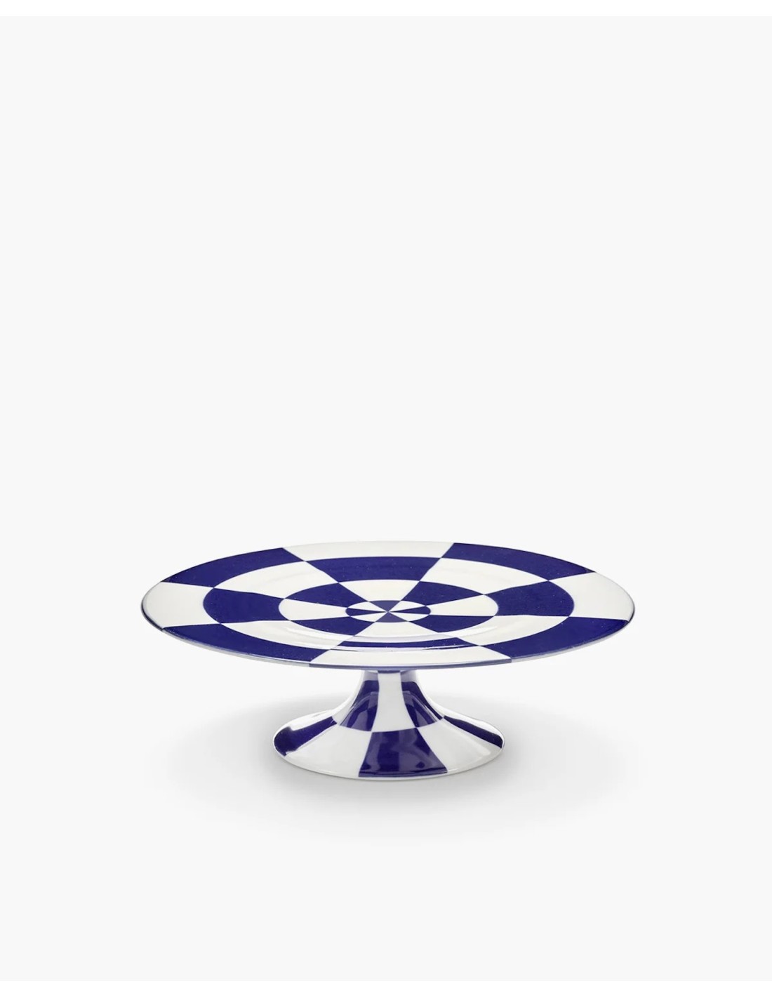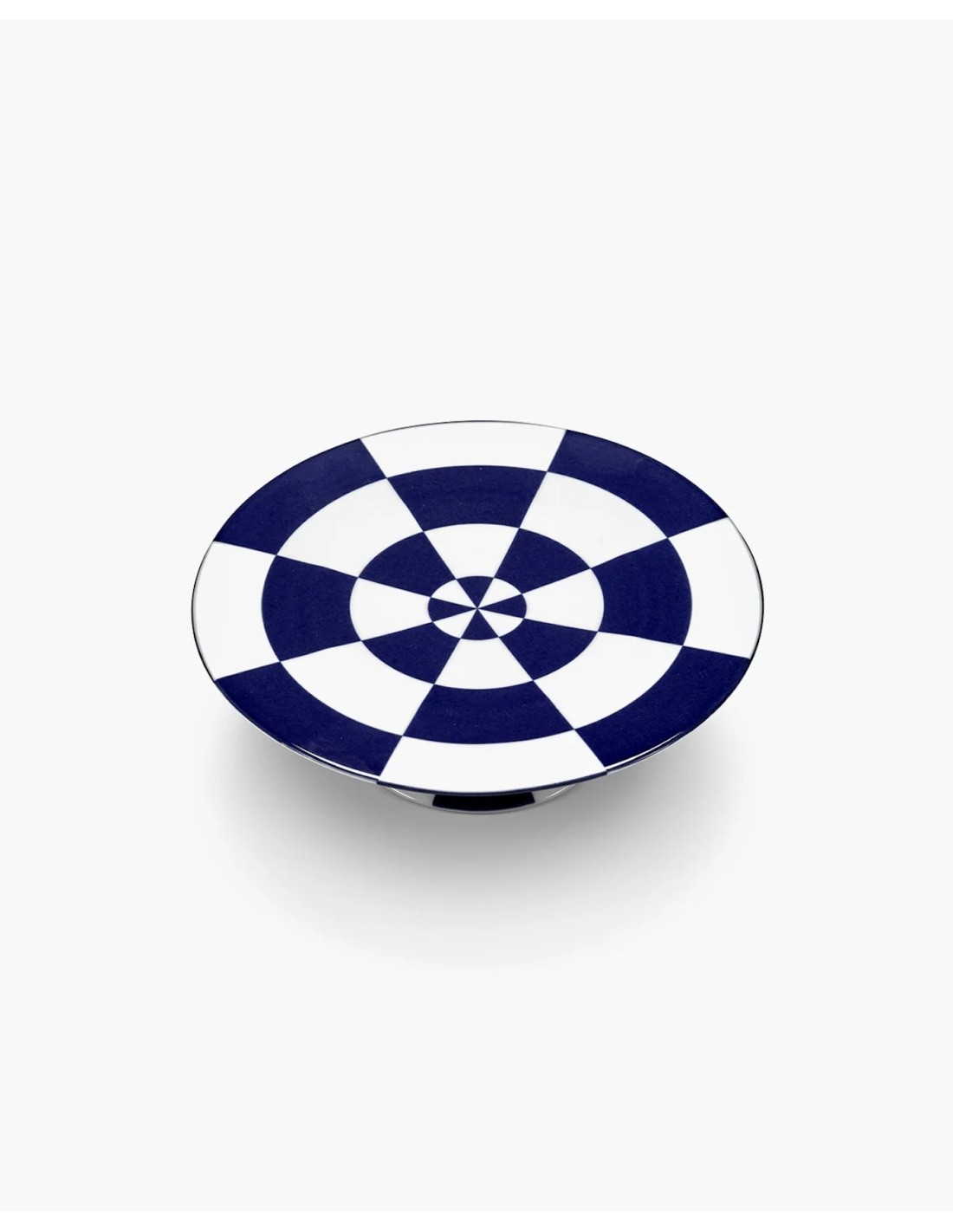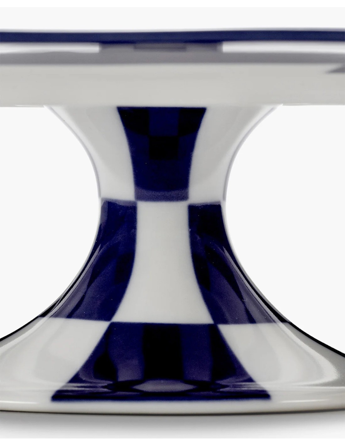 Ce présentoir à gâteau de la série Fête des Bêtes se distingue par un motif en damier bleu et blanc audacieux. Élevé sur un pied sculptural, il transforme les pâtisseries en véritable mise en scène théâtrale.