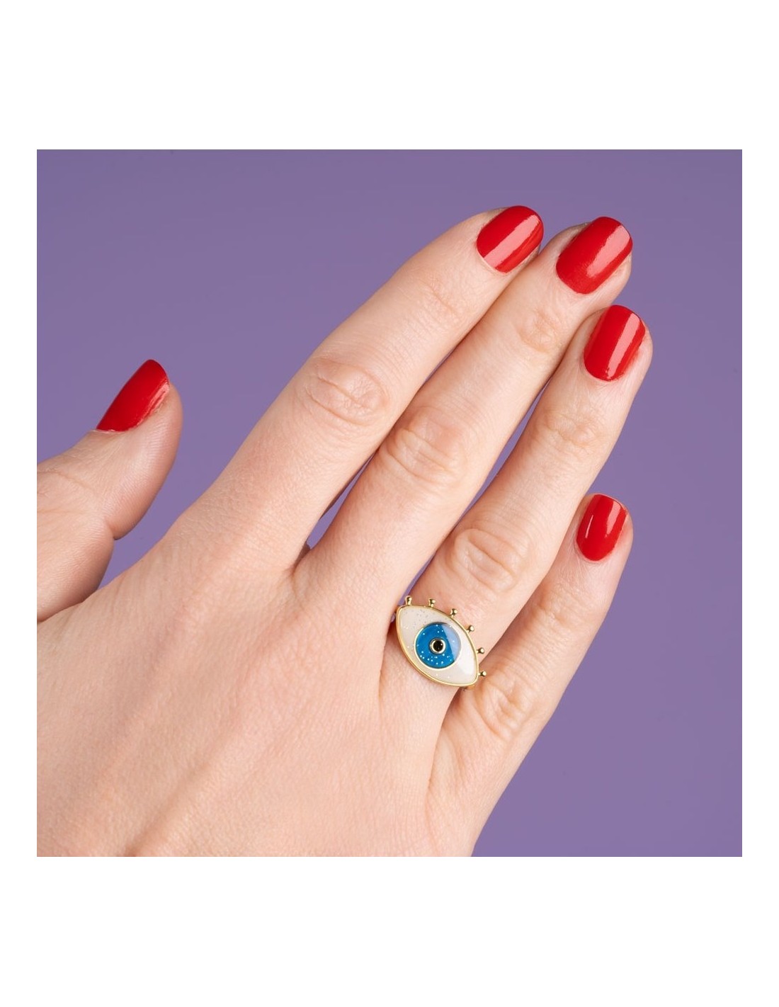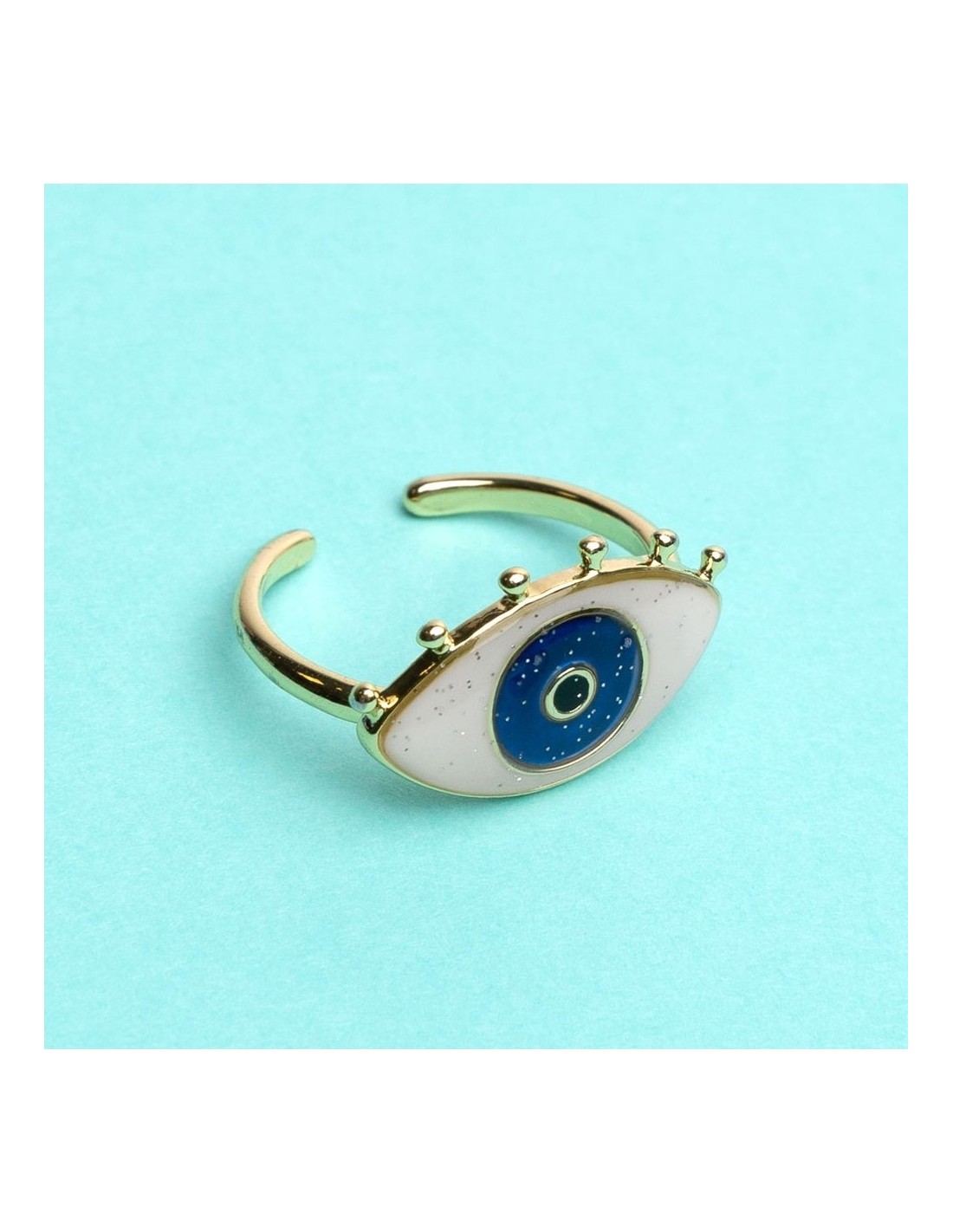 Un bijou original avec son bel iris subtilement pailleté, ajustable (convient à tous les doigts du monde) & plaqué or 5 micron, accompagné de sa petite carte “humeurs”.