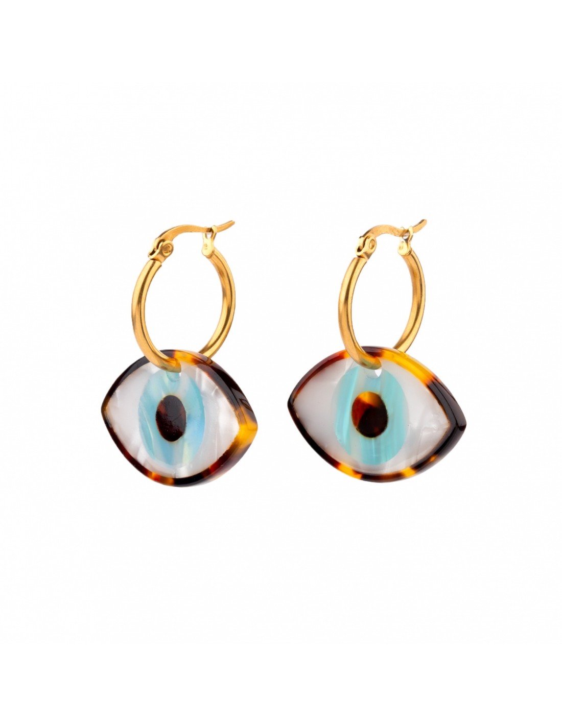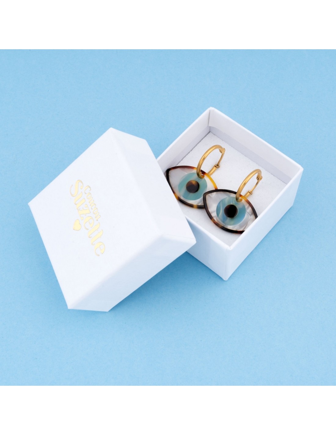 L'œil bleu, l’emblème adoré de Coucou Suzette, se décline à l’infini ! Il revient ici sous forme de boucles d’oreilles rétro, suspendu à un petit anneau plaqué or, avec ses bordures écailles de tortue et son iris bleu turquoise irisé. À porter en journée ou pour les soirs de fête, comme un petit gri-gri qui vous portera bonheur partout où vous irez !