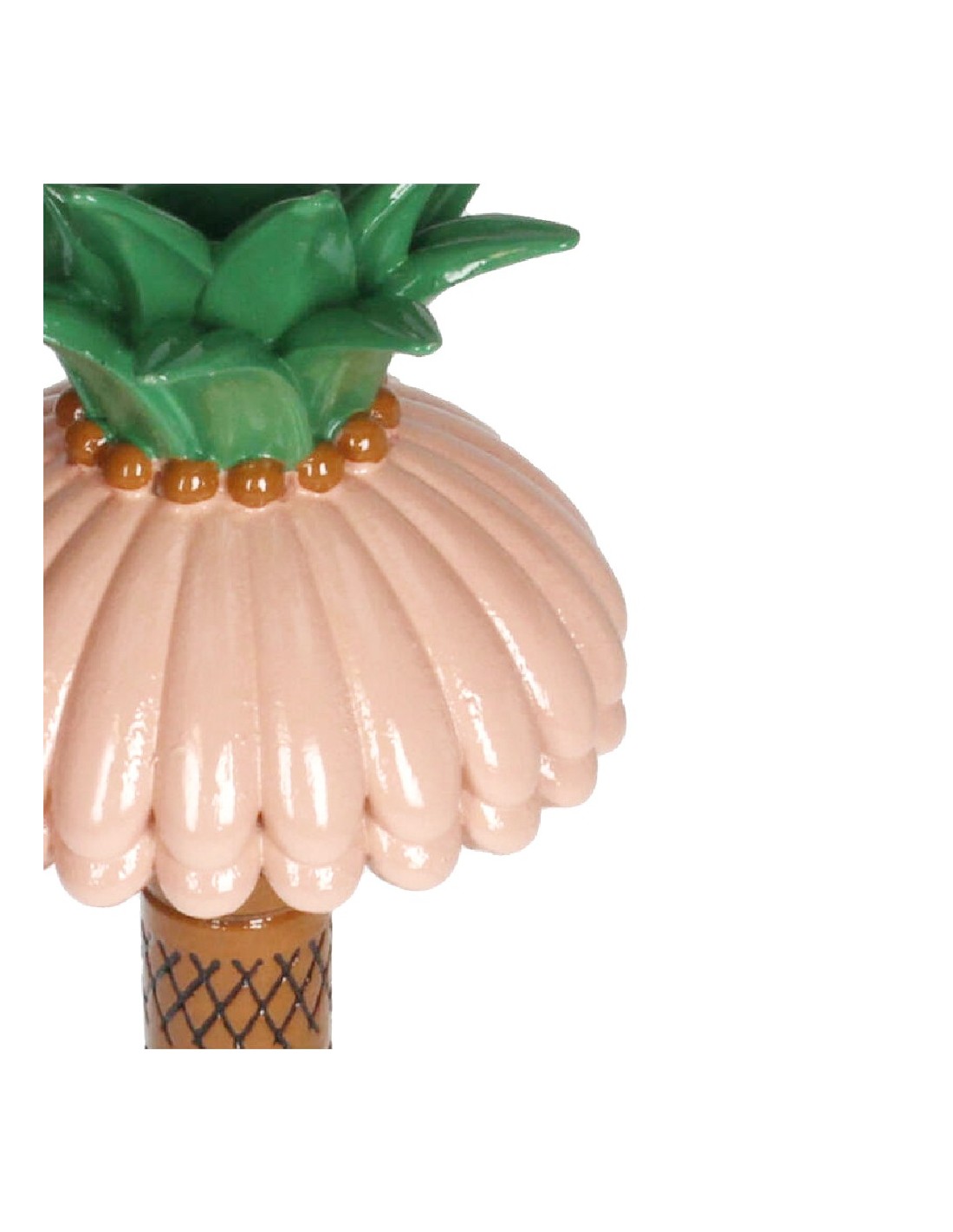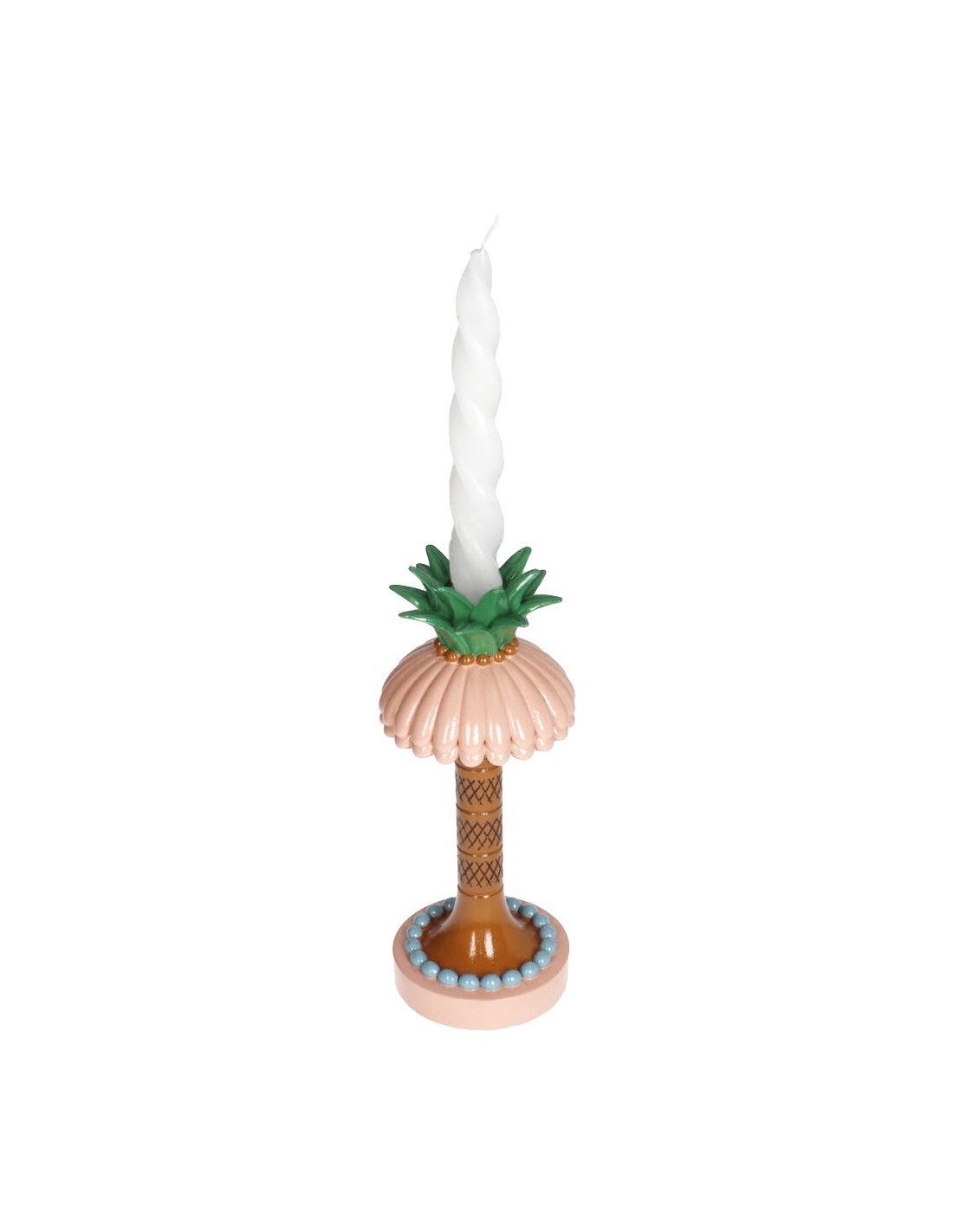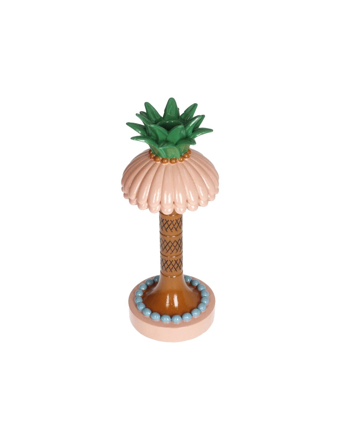 Ce bougeoir palmier en céramique est un eye-catcher au style tropical et vintage. Avec sa canopée rose, son tronc brun détaillé et ses feuilles vertes, ce bougeoir dégage de la gaieté et de l’énergie estivale. Les accents bleus au pied le rendent ludique et élégant. Parfait comme objet de déco et pourquoi pas comme pied de lampe pour un décor d’inspiration tropicale ;)