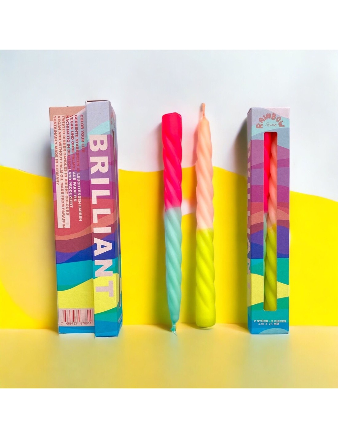 Assortiment de 2 bougies torsadées RAINBOW STUDIO de PINK STORIES, teintées à la main, sans huile de palme, fabriquées en Bavière (plus d’infos en bas de page)