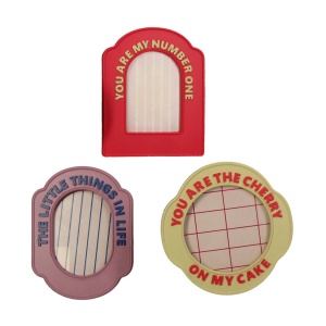 Trois petits cadres photo en polyrésine de différentes couleurs, parfaits pour exposer de petites photos. Du coup, on sait pas lequel choisir ;)