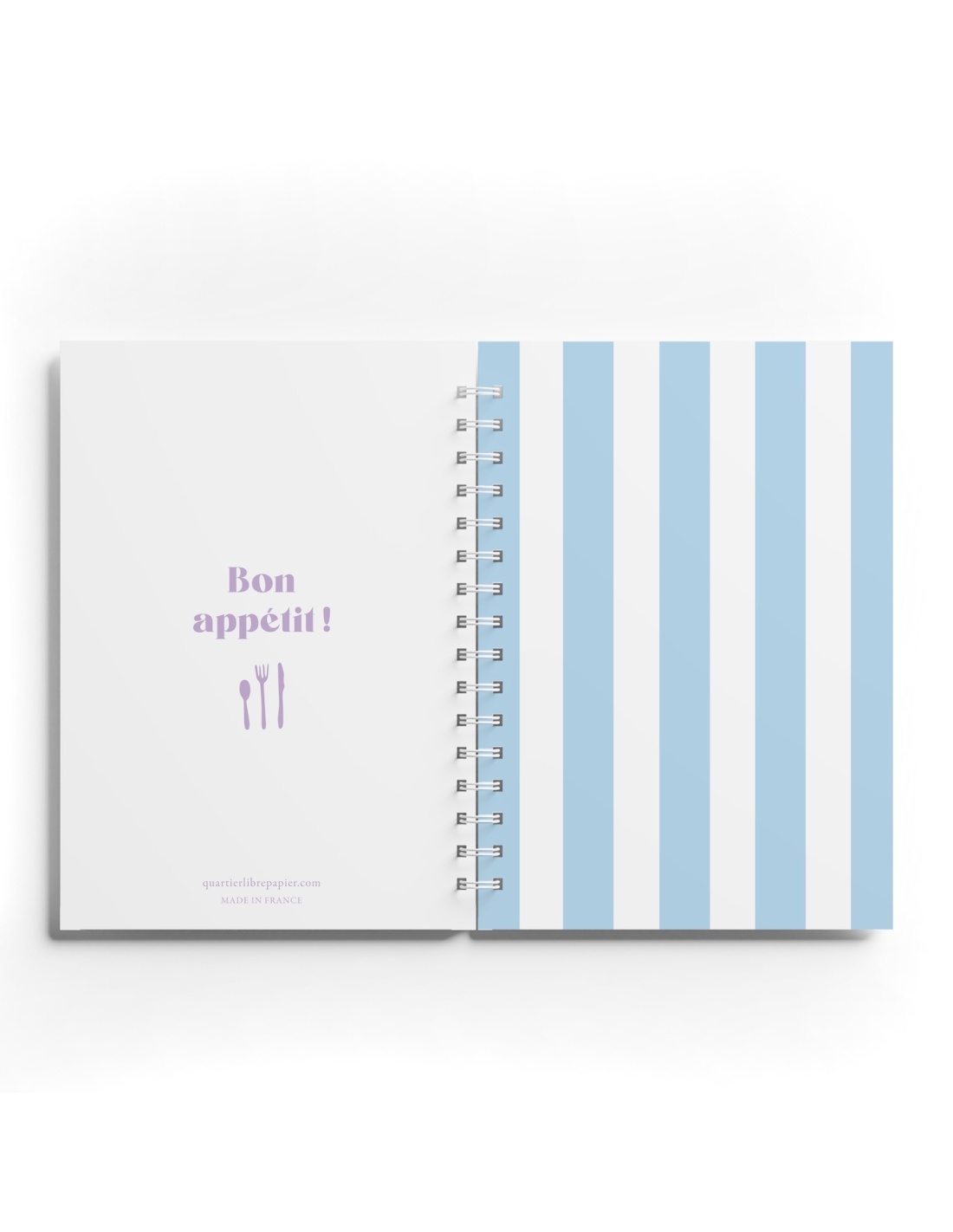 Carnet de recettes QUARTIER LIBRE PAPIER, 160 pages imprimées pour 78 recettes numérotées, reliure à spirale métal, fabriqué en France (plus d'infos en bas de page)