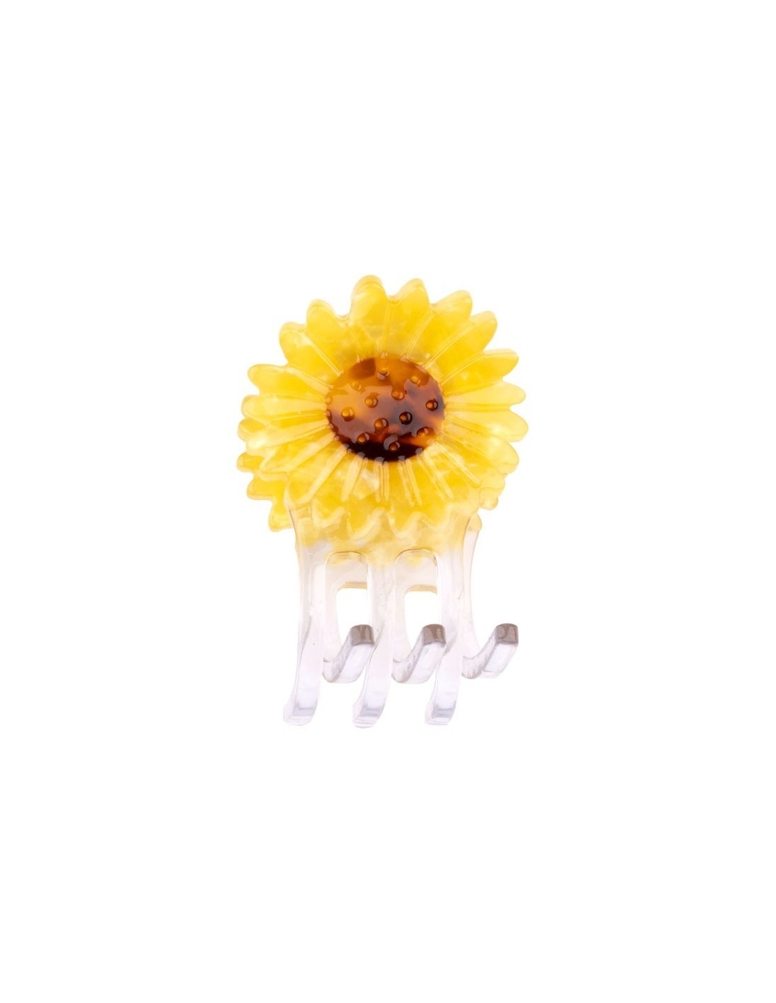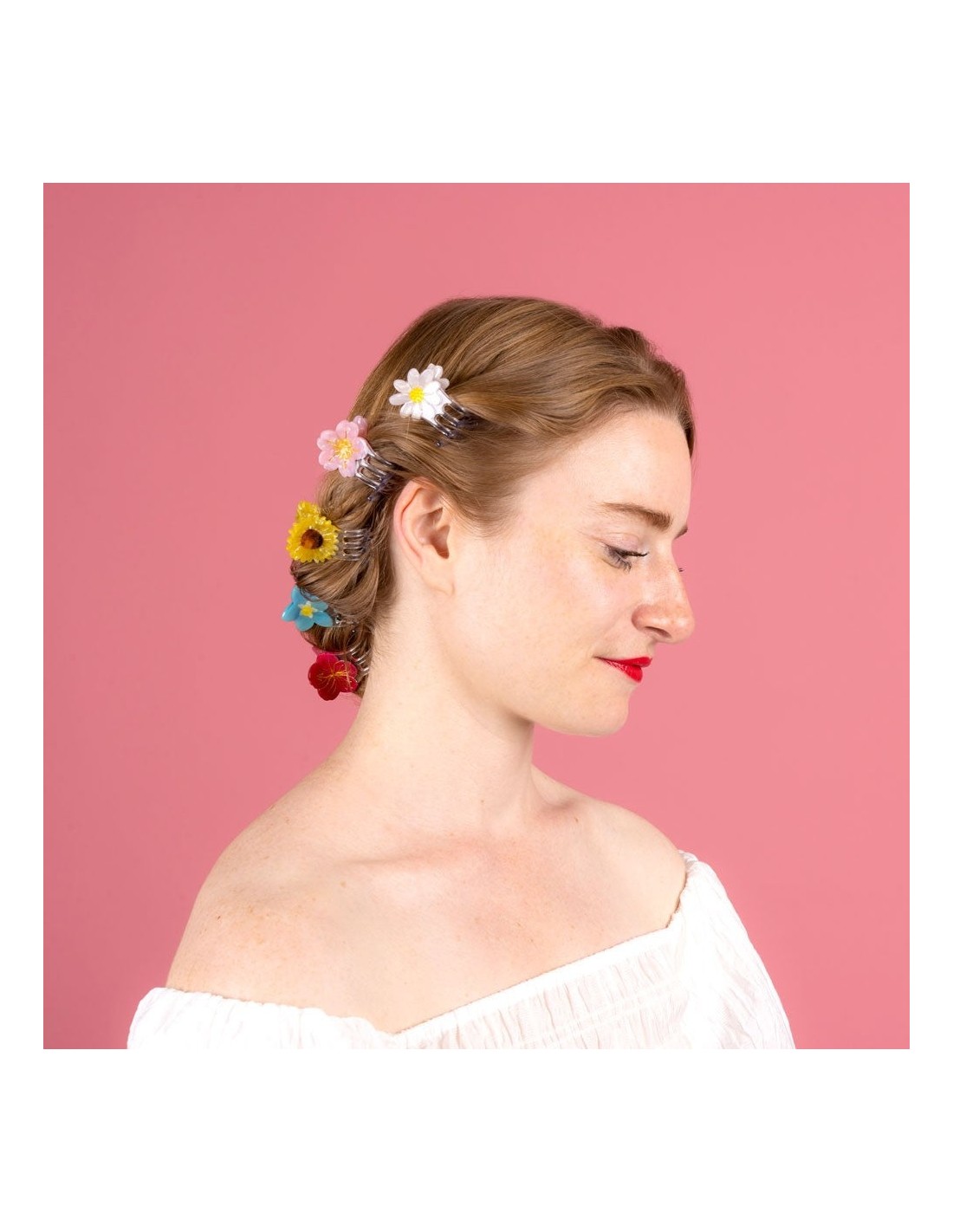 Une petite myosotis plus vraie que nature, un baby tournesol, une petite pince à cheveux agrémentée d’un joli hibiscus rose fuchsia à paillettes, mini pince pâquerette qui nous rappelle celle qu’on mettait derrière l’oreille pendant nos balades à la campagne étant enfant ou une mini pince sankura, on adore!