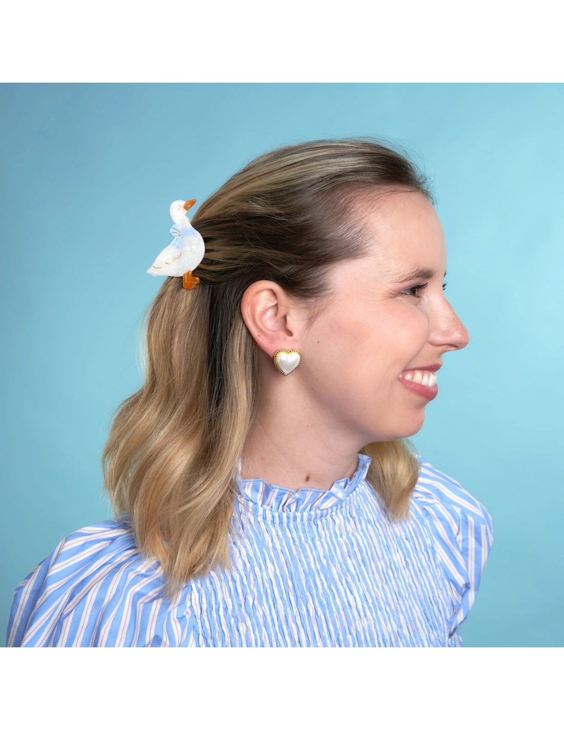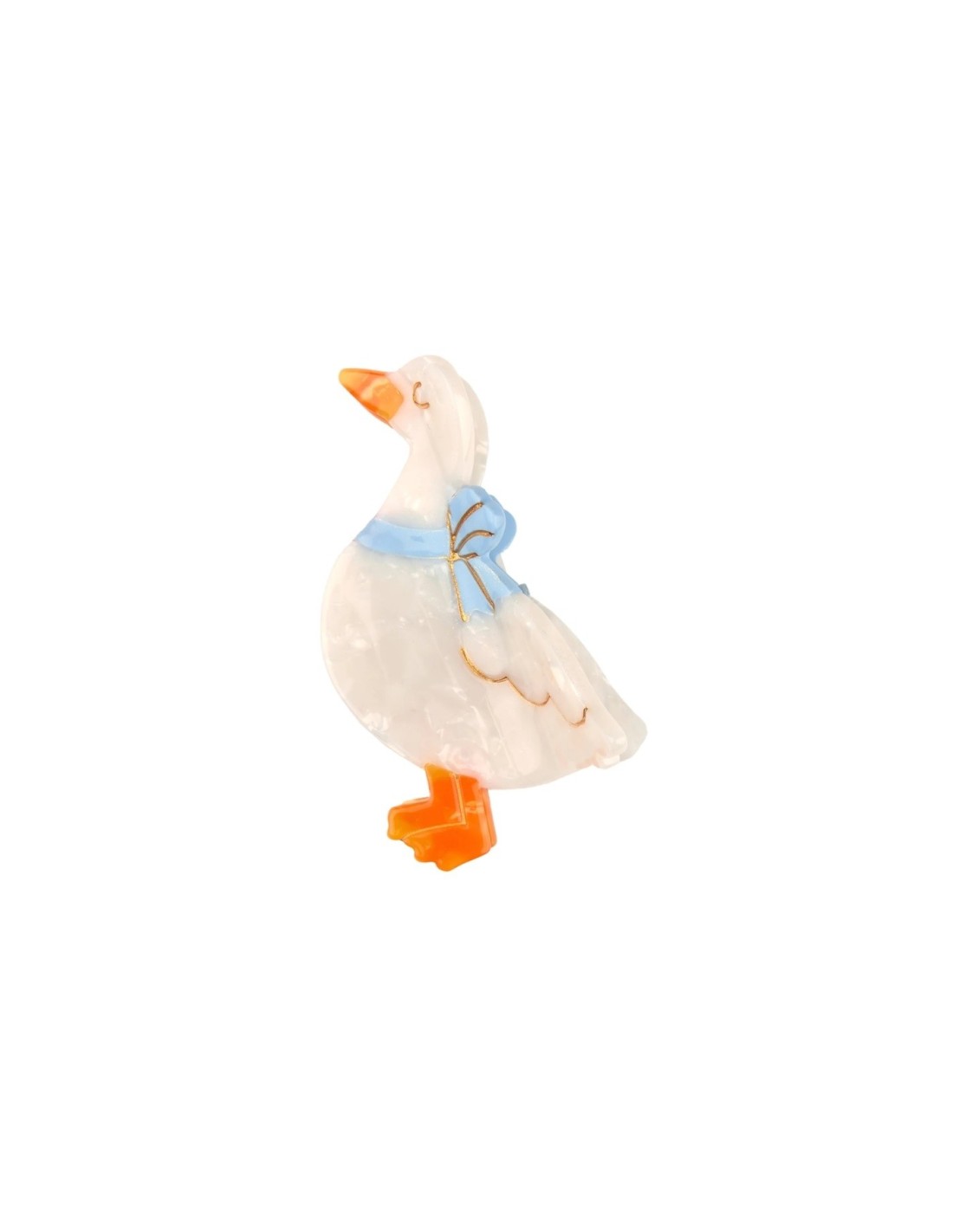 Une mignonne petite oie à la recherche d’une chevelure pour y faire son nid. On craque pour cette mini pince à cheveux régressive et cet oiseau au plumage nacré, fièrement décoré d’un ruban bleu ciel. Le plus original des accessoires pour décorer tous nos chignons !