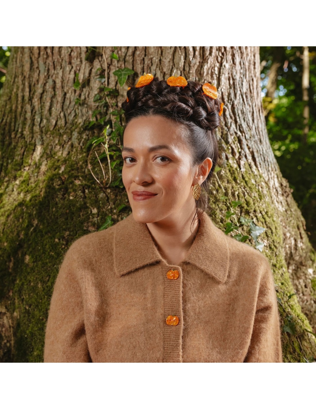 Pour les cheveux fins, elle fait de jolies demi-queues, pour les cheveux longs, elle sécurise comme il faut les chignons hauts : c’est la mini pince citrouille ! Dans le même esprit que sa grande sœur, elle célèbre discrètement mais sûrement la saison automnale.