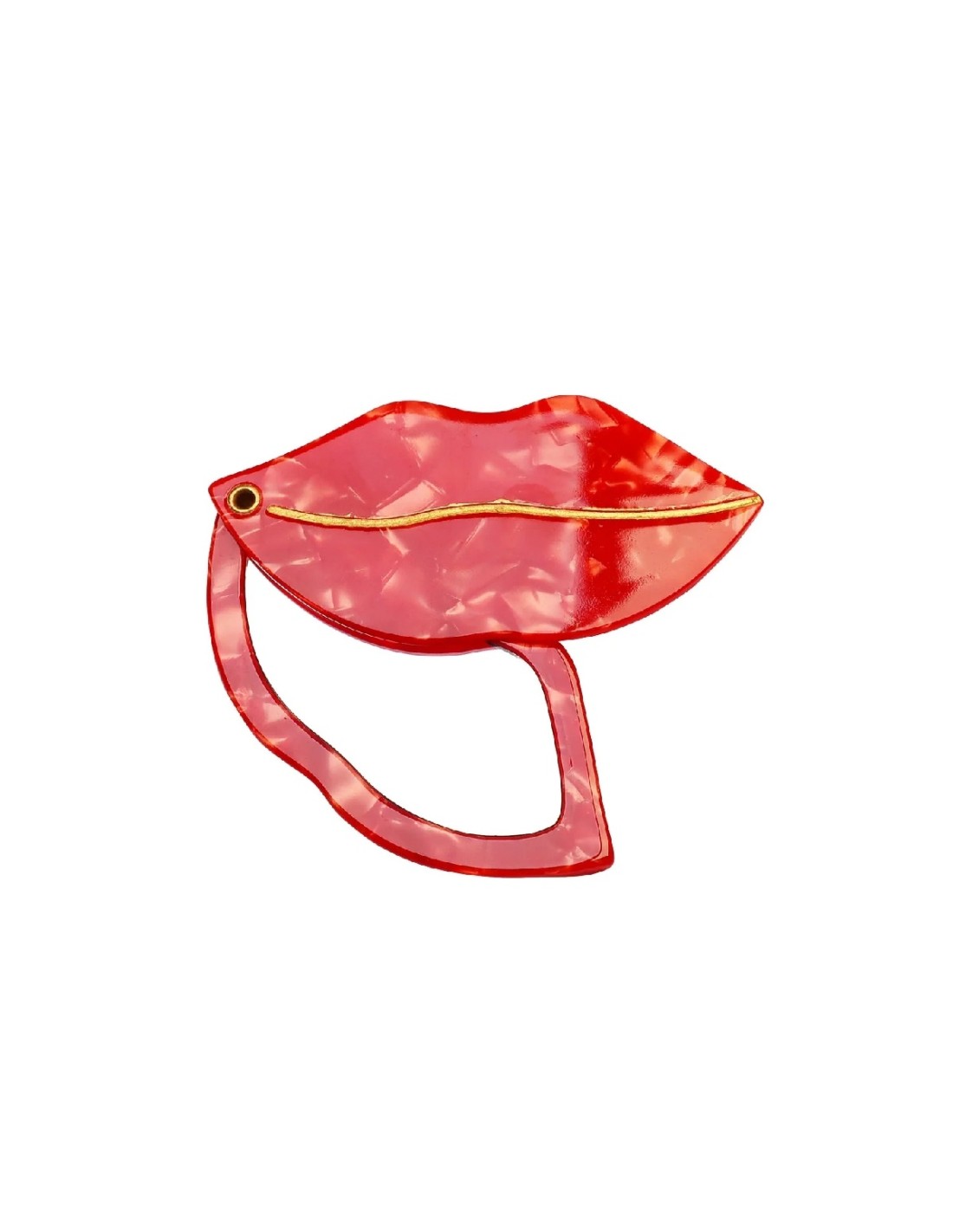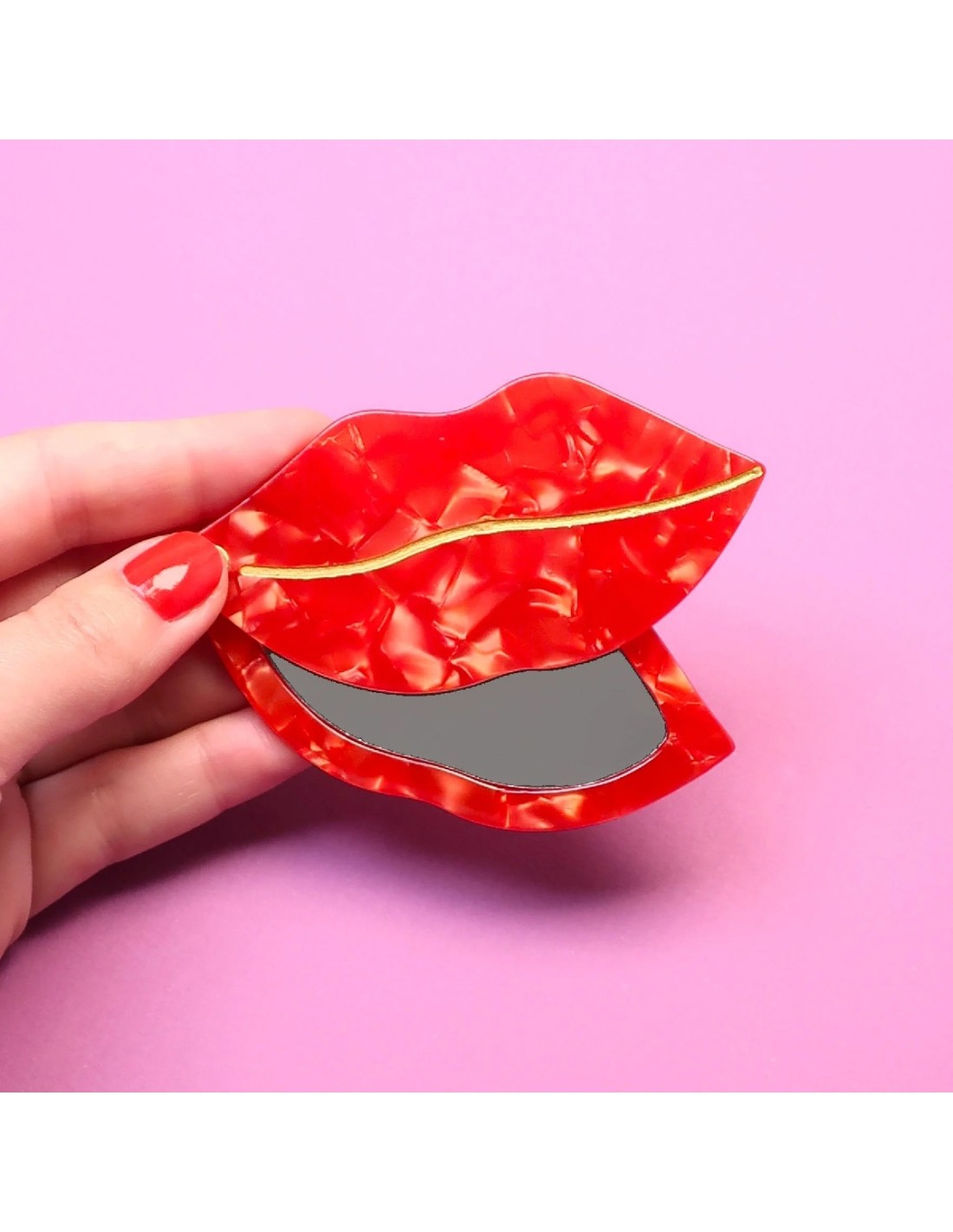 Un petit miroir de poche en forme de bouche rouge pulpeuse à souhait en acetate façon rétro. Parfait pour les retouches rouge à lèvre après avoir englouti un burger. Tout léger, il prend peu de place et est super à glisser dans son sac vintage !