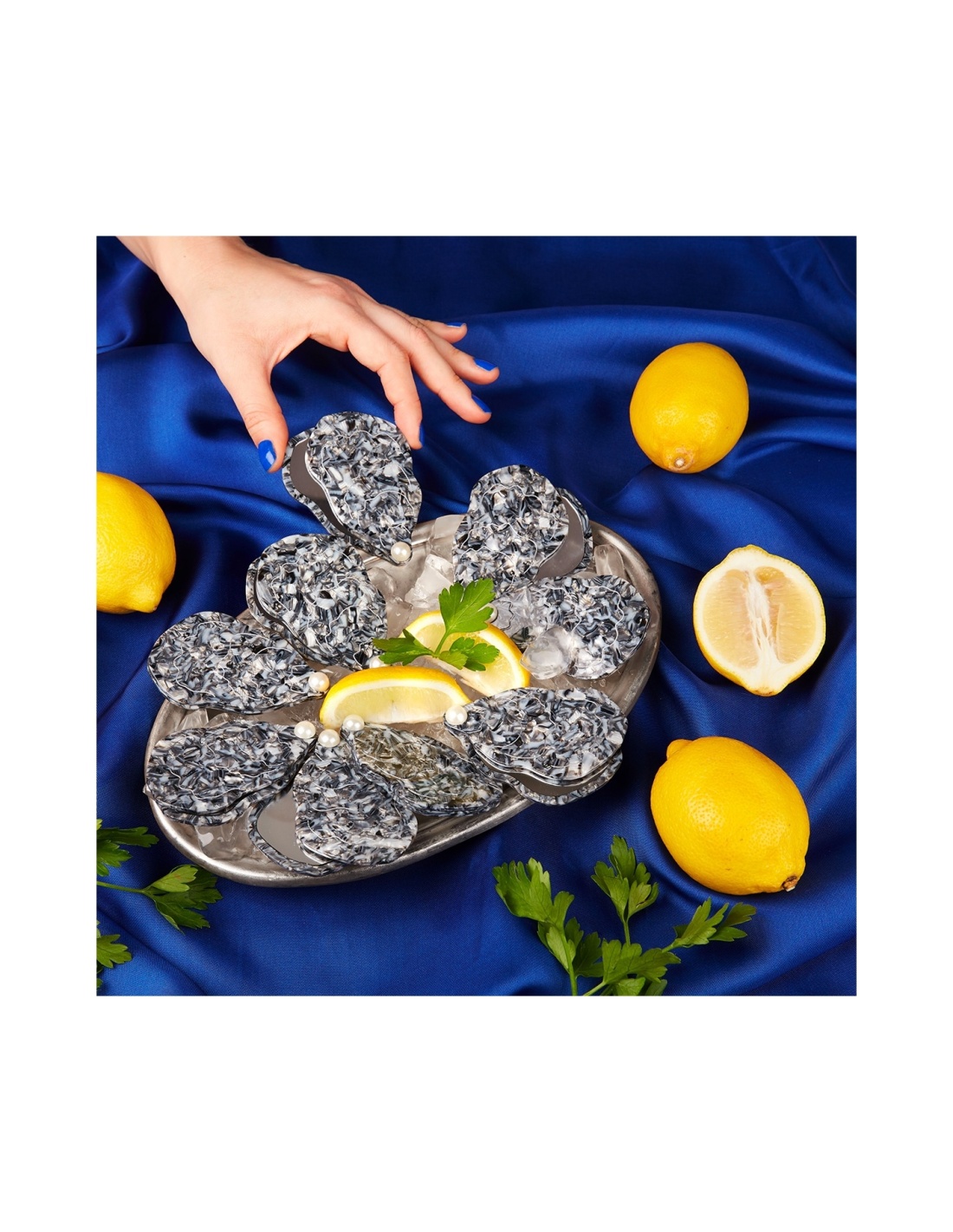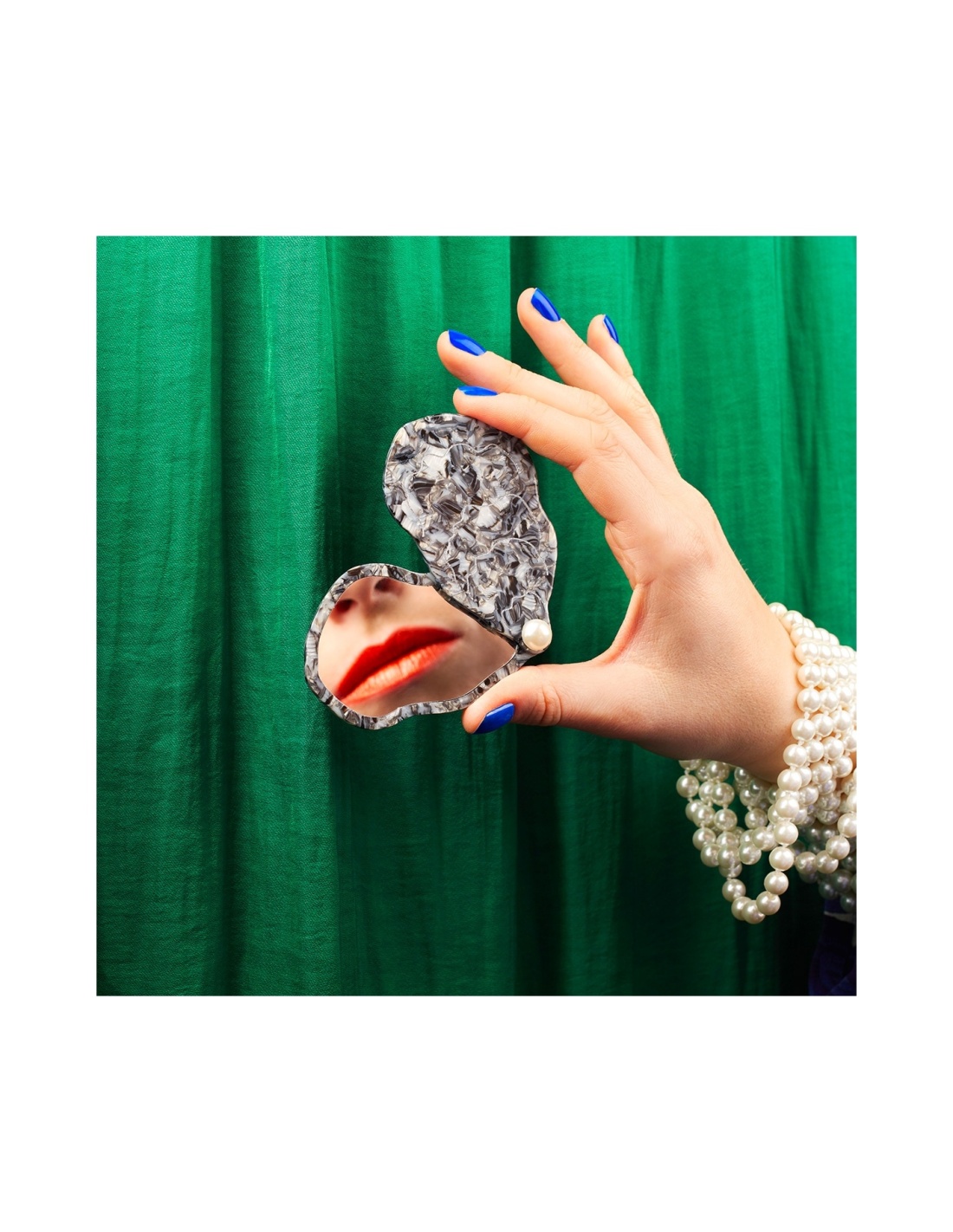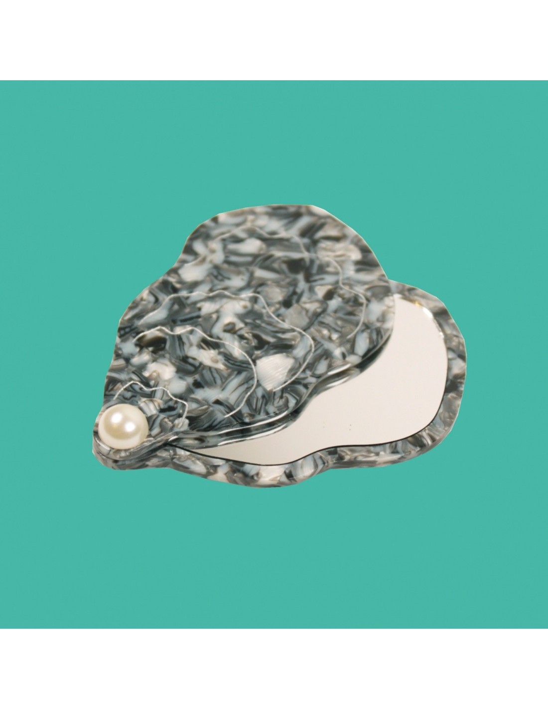 "Miroir, mon beau miroir… Dis-moi qui est la plus stylée." Miroir de poche kitsch en forme d’huître avec sa petite perle qui s’ouvre en un claquement de doigt. Cet accessoire est réalisé à partir d'acetate de cellulose recyclée & biodégradable (eco-friendly), logo gravé à l'extérieur en doré.