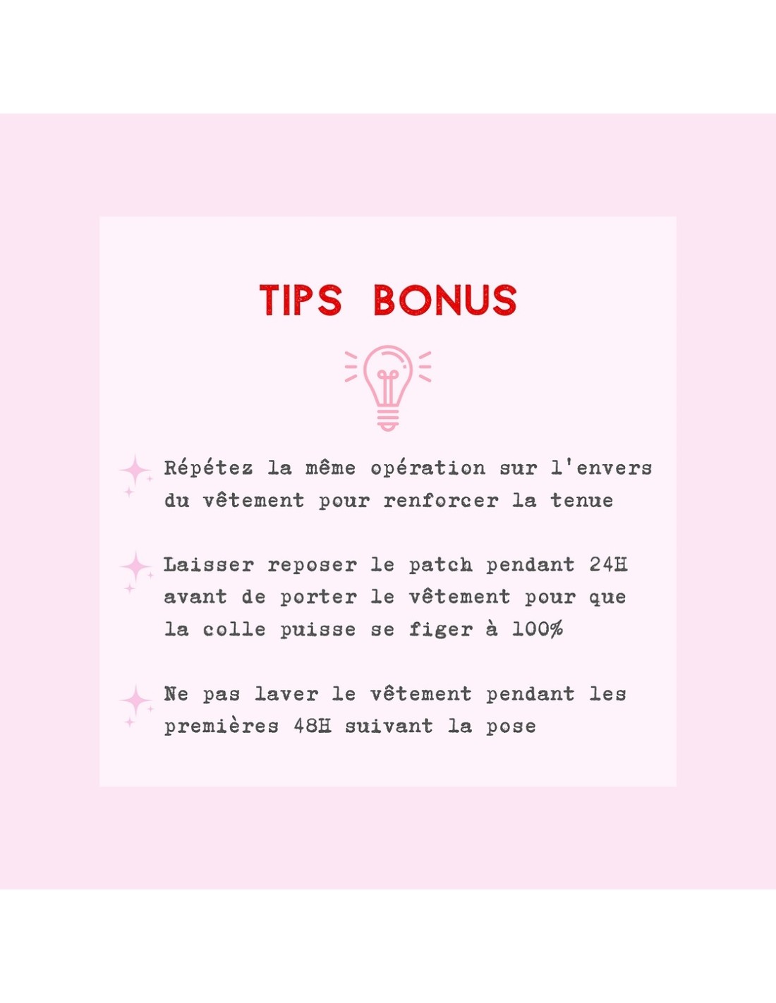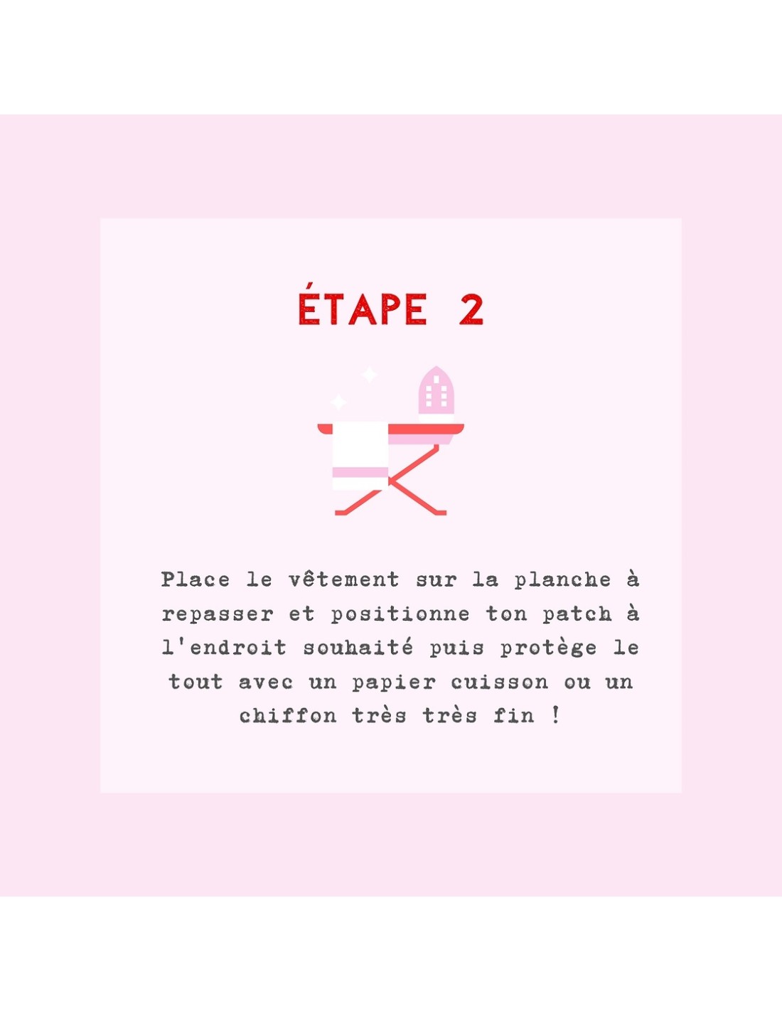 ✨ Tips : vérifier sur l'étiquette de composition / entretien du vêtement s'il est indiqué le symbole "fer à repasser barré" alors il vaut mieux éviter de thermocoller le patch. Mais ne t'inquiètes pas, sur ces matières tu peux coudre à la machine ou à la main.