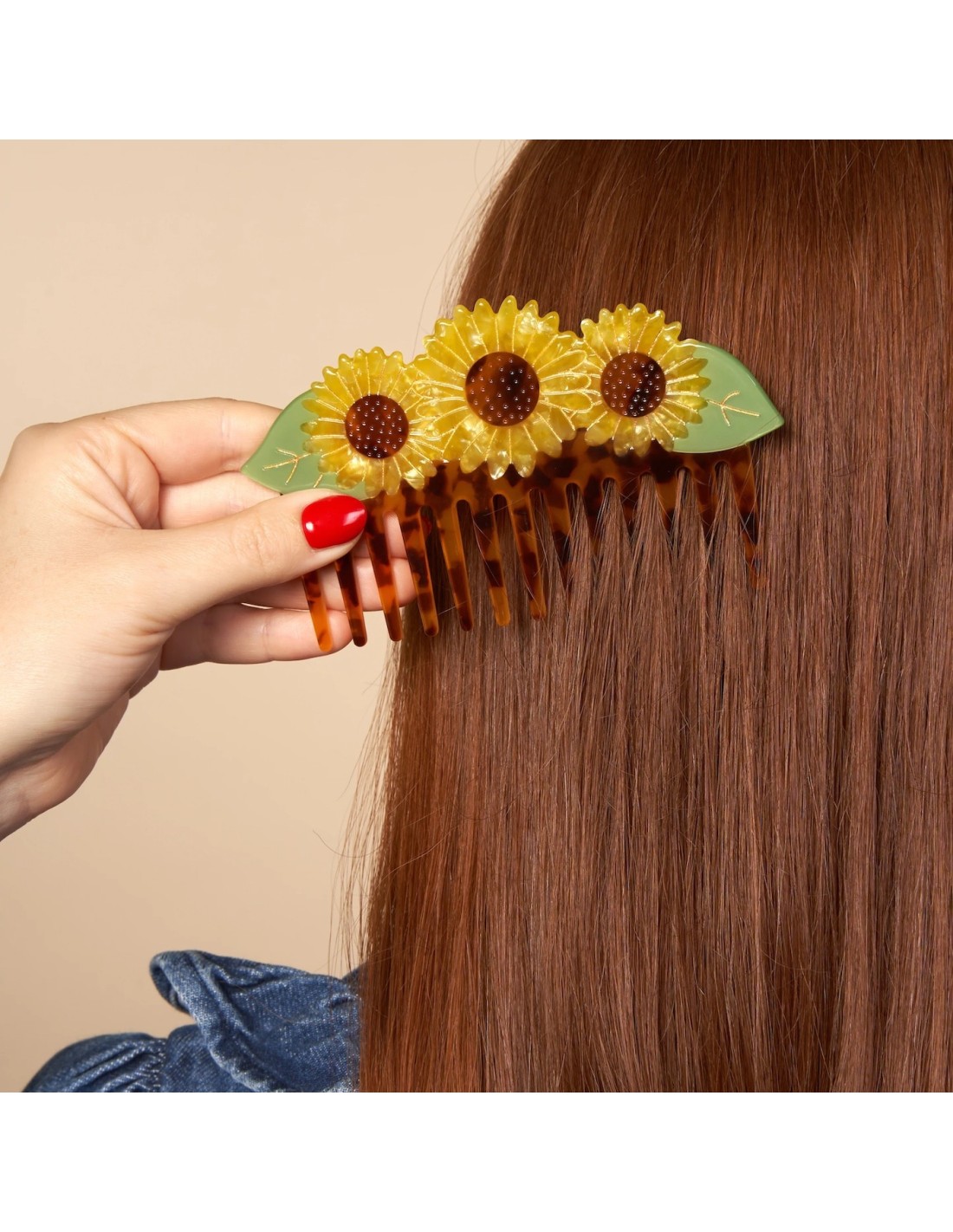 Pour commencer la journée du bon pied, on se coiffe avec ce magnifique peigne tournesol. Un trio de fleurs rayonnantes, déclinées de notre seule et unique pince tournesol, prêt à démêler nos crinières comme personne !