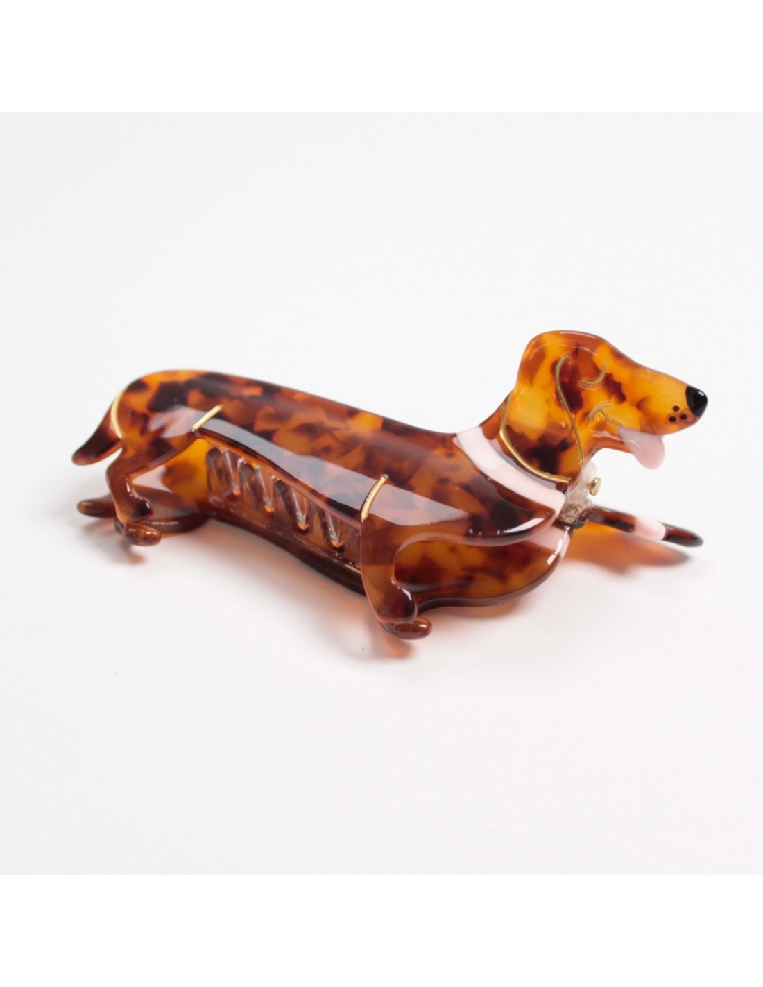Petit Teckel qui assure la garde de votre style capillaire. Chez Coucou Suzette on adore cette race de chiens qui ressemble à une petite saucisse, alors on a imaginé l'accessoire à cheveux idéal : original, rigolo et qui se glisse facilement dans le sac à main. Le détail qu’on aime ? Sa petite moue fière avec sa langue qui pendouille. Cette barrette écaille de tortue est faite à partir d'acetate de cellulose recyclée & biodégradable (eco-friendly).