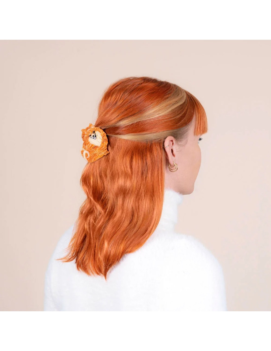 Une pince à cheveux en forme d’adorable boule de poil ! On fond pour ce petit Spitz qui nous regarde tout sourire avec ses belles couleurs crèmes et orangées. Un accessoire chien qui ponctue à merveille toutes nos coiffures.