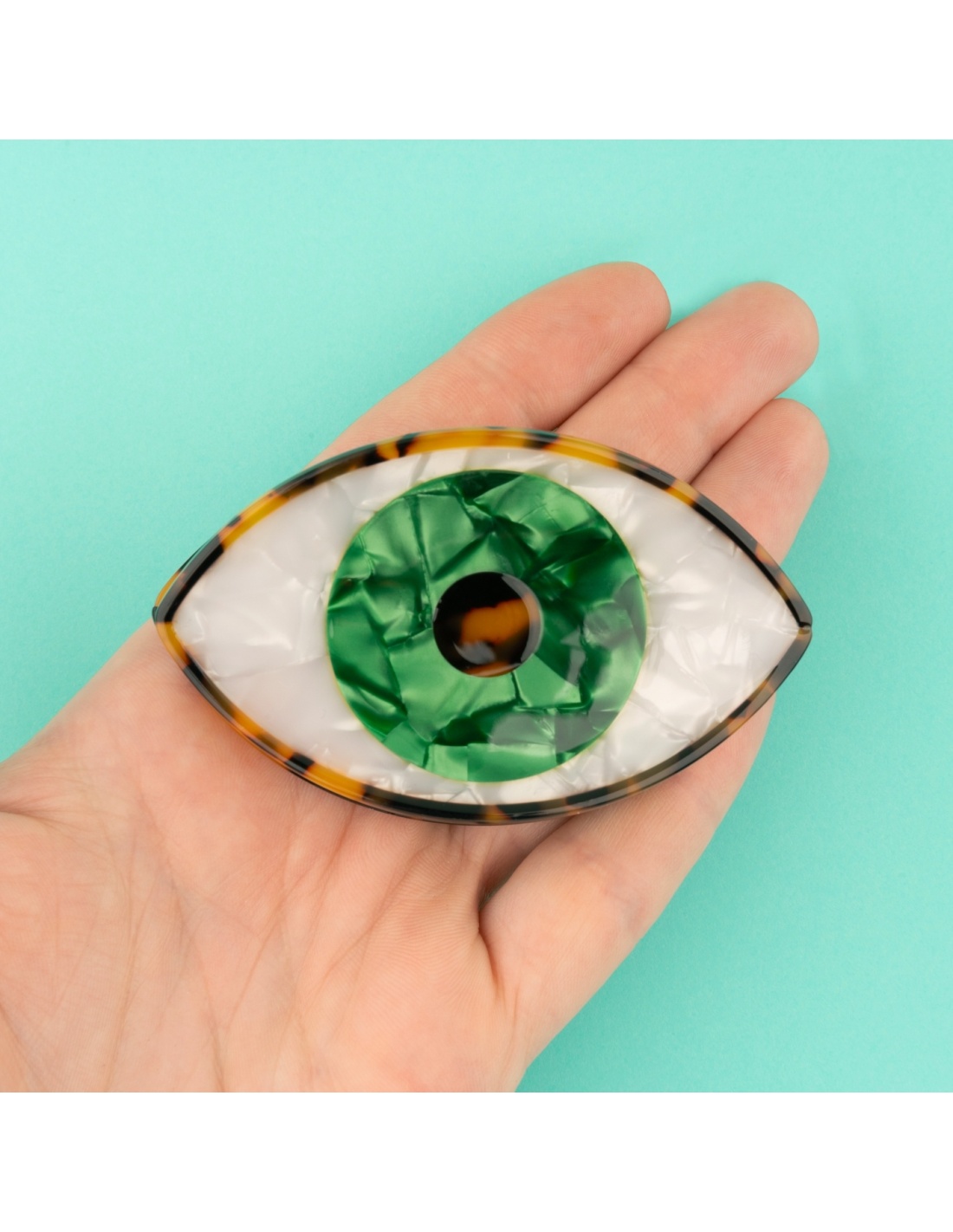 L’œil, l’emblème chouchou de Coucou Suzette pour pimper nos coiffures & sublimer un look un poil trop sage en un rien de temps ! On est fan de son esprit pop & retro! Cette barrette à cheveux irisée bleue, blanche & marron est faite à partir d’acetate de cellulose recyclée & biodégradable (eco-friendly).