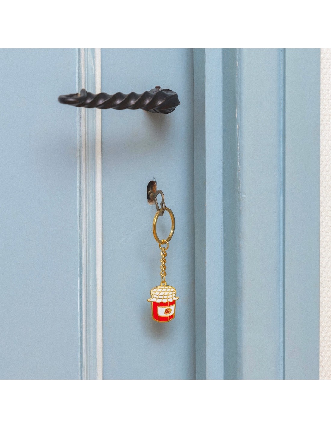 Pour changer du porte-clés moche ramené de voyage par Tonton, on opte pour cet adorable pot de confiture à la fraise souligné de jolies dorures, non sans nous rappeler les petits-déjeuners en famille. Enfin un accessoire à la hauteur de notre trousseau.