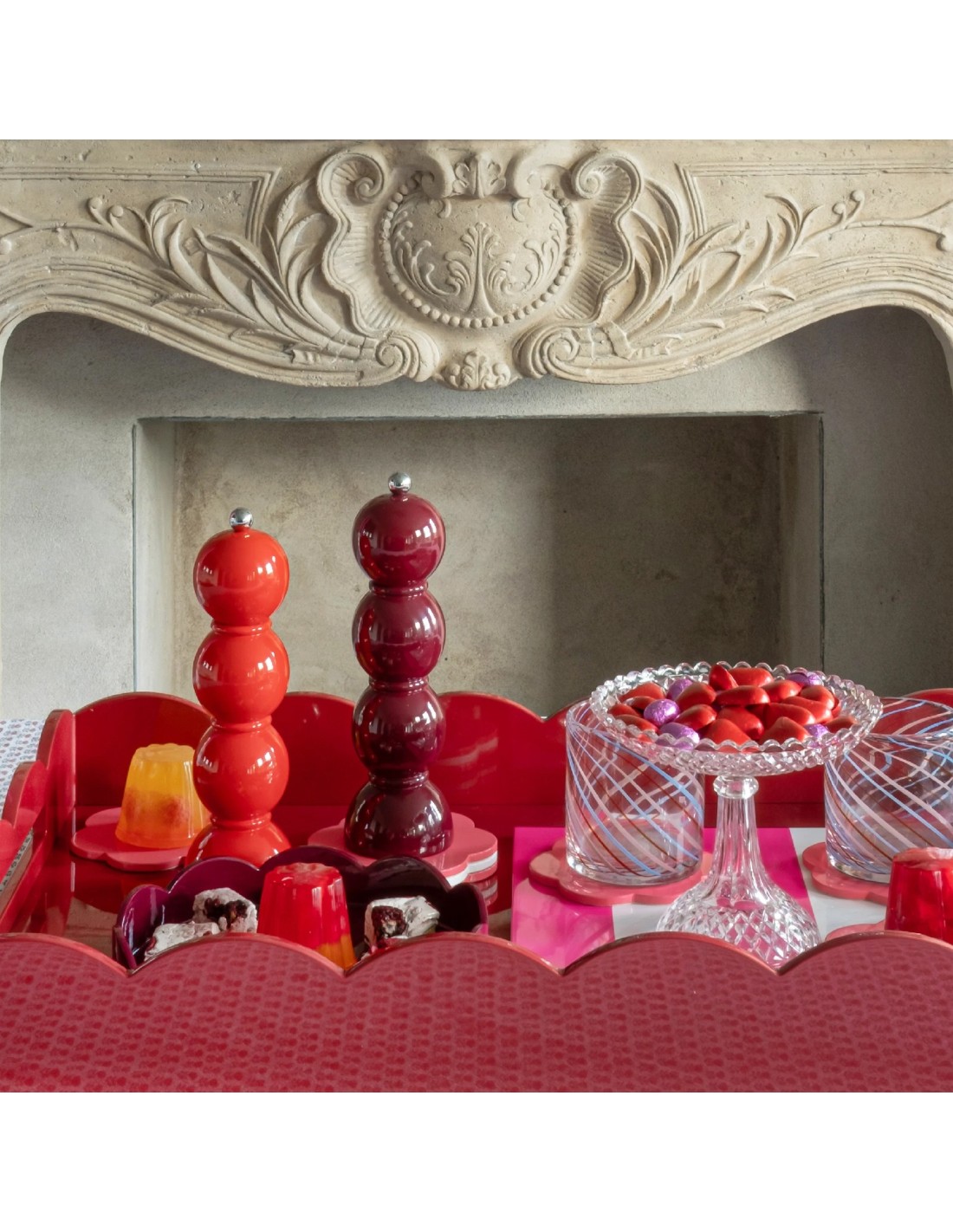 Ces moulins sont fabriqué en bois d'hévéa massif, certifié FSC, avec une finition de 8 couches de laque haute brillance, polies à la main entre chaque couche. Avec un mécanisme en céramique, le moulin s'utilise en tournant dans le sens des aiguilles d'une montre. Les moulins peuvent être utilisés pour moudre soit du sel gemme (cristaux de sel sec), soit des grains de poivre noir. Ne pas utiliser pour le sel marin, le sel humide, le sel humide séché ou les grains de poivre rose.