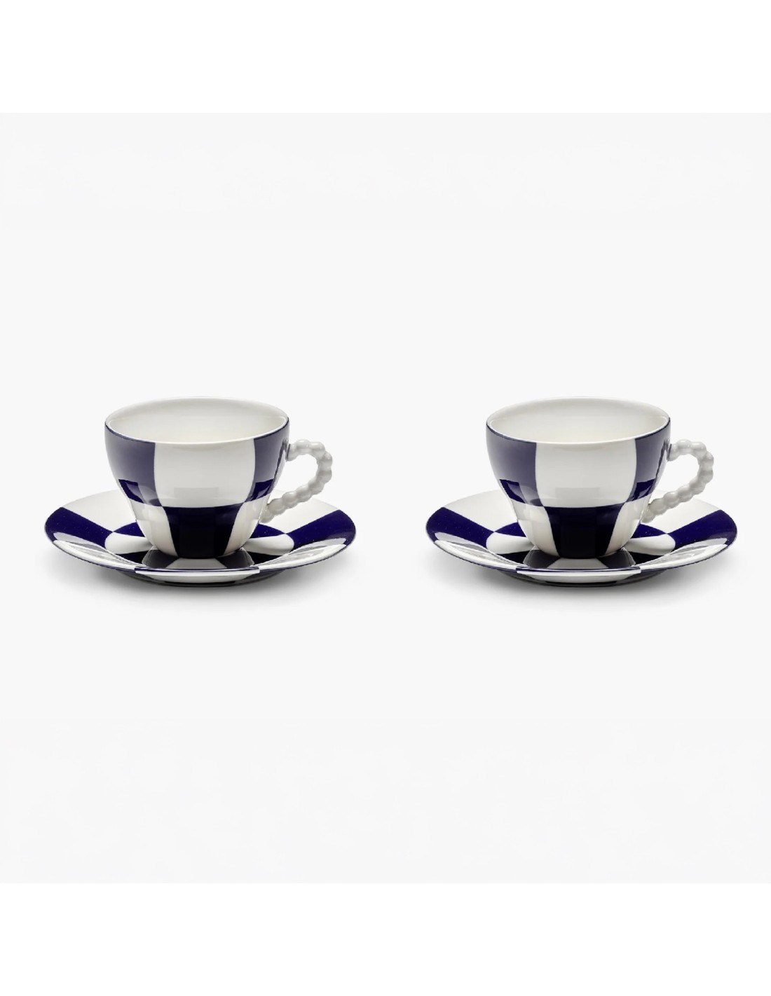 Ces deux tasses et leurs soucoupes de la collection Fête des Bêtes allient l'élégance classique à un audacieux motif à damier bleu et blanc. Le décor graphique apporte une touche surréaliste, transformant l'ensemble en une pièce maîtresse remarquable pour votre table.